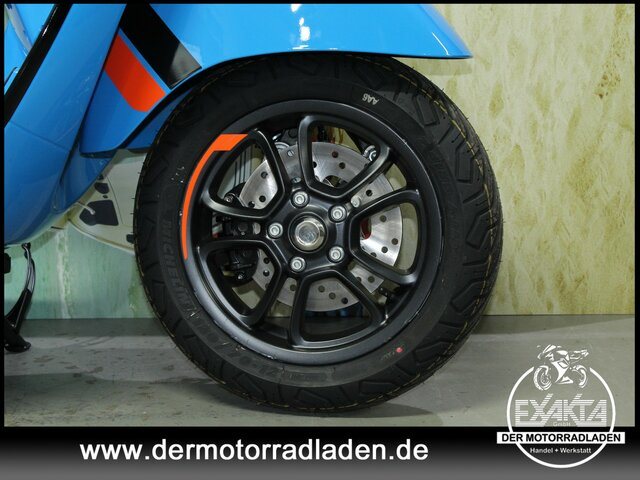 Die neuen zweifarbigen Leichtmetallfelgen erinnern an die zerlegbaren Felgen von früher und unterstreichen die Sportlichkeit des 145sten Modells in der Geschichte von Vespa, auch dank der roten Feder der Vorderradaufhängung und der neuen Frontkaskade, die auf das Standlicht verzichtet, um einen mit verchromten Elementen bereicherten Grill zur Schau zu tragen.