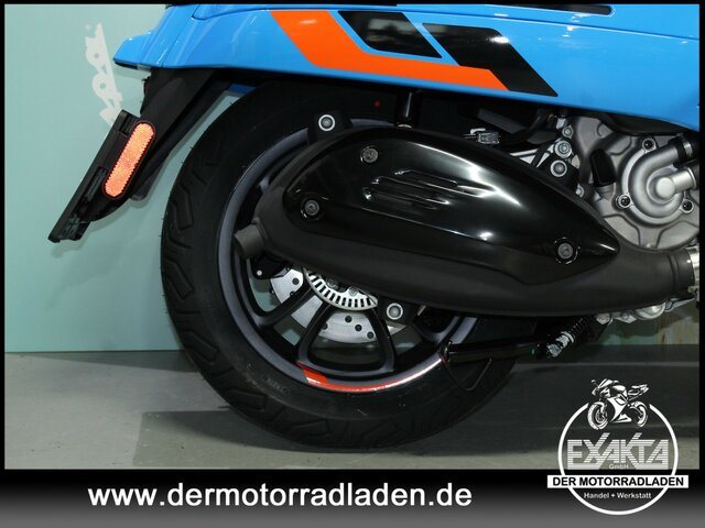 Die neuen zweifarbigen Leichtmetallfelgen erinnern an die zerlegbaren Felgen von früher und unterstreichen die Sportlichkeit des 145sten Modells in der Geschichte von Vespa, auch dank der roten Feder der Vorderradaufhängung und der neuen Frontkaskade, die auf das Standlicht verzichtet, um einen mit verchromten Elementen bereicherten Grill zur Schau zu tragen.
